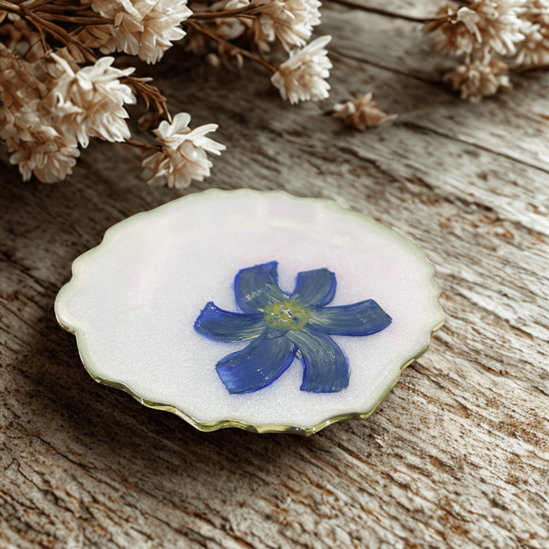 Bring elegance and calm to your tabletop with our Blue Blossom Edge Resin Coasters. Each coaster is beautifully handcrafted with a soft pearly white base, adorned with a hand-embedded blue floral design at the center. The subtle gold-edged scalloped border adds a touch of luxury, making these coasters perfect for both daily use and special occasions.