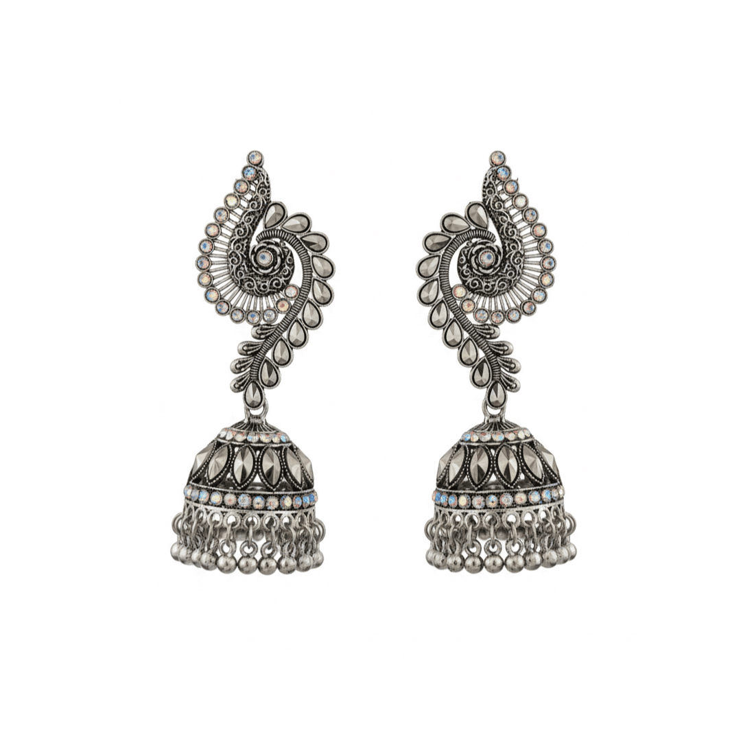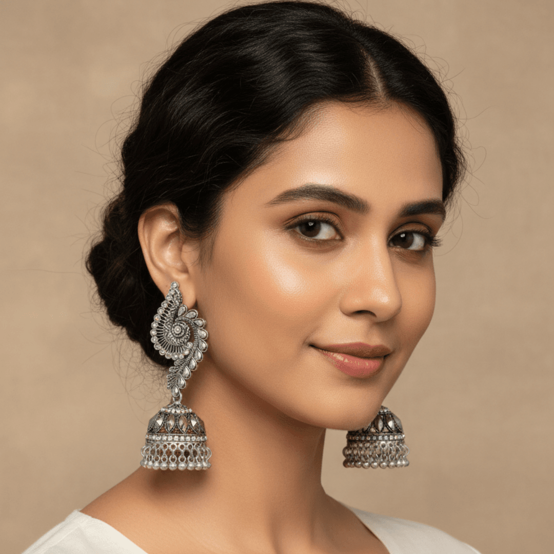 Add a touch of sophistication to your ethnic look with these Elegant Silver Kundan Jhumka Earrings. Designed with intricate detailing and shimmering Kundan stones, these earrings are a perfect blend of traditional artistry and timeless elegance.