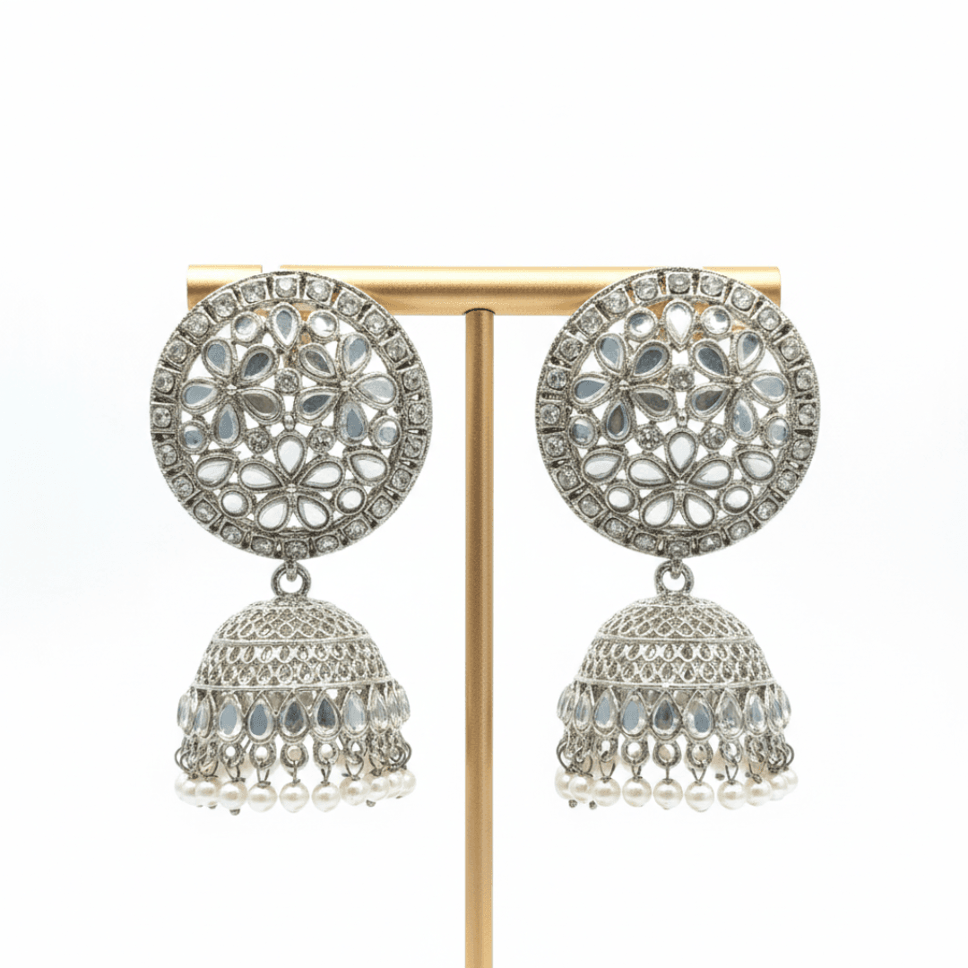 Add a touch of sophistication to your ethnic look with these Elegant Silver Kundan Jhumka Earrings. Designed with intricate detailing and shimmering Kundan stones, these earrings are a perfect blend of traditional artistry and timeless elegance.