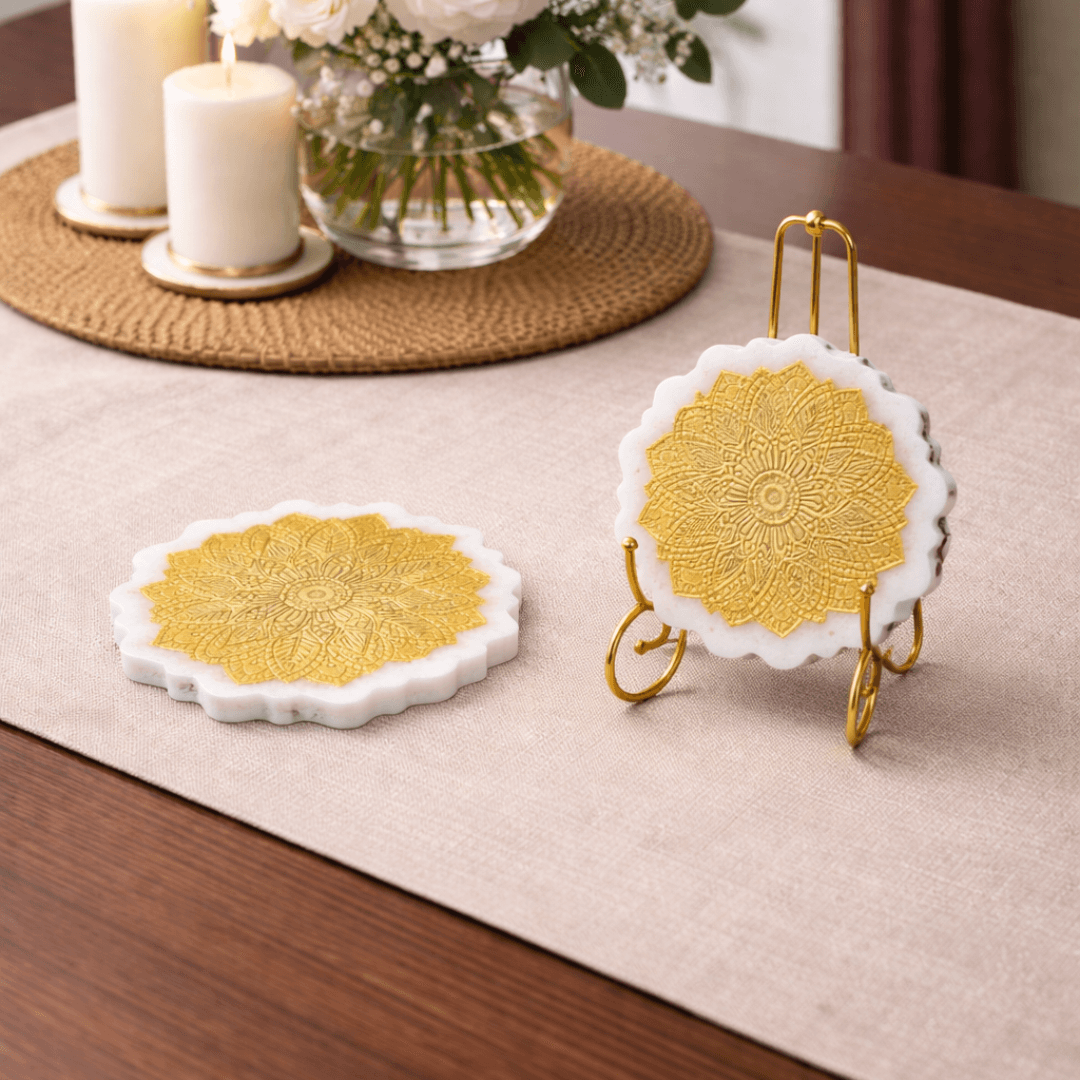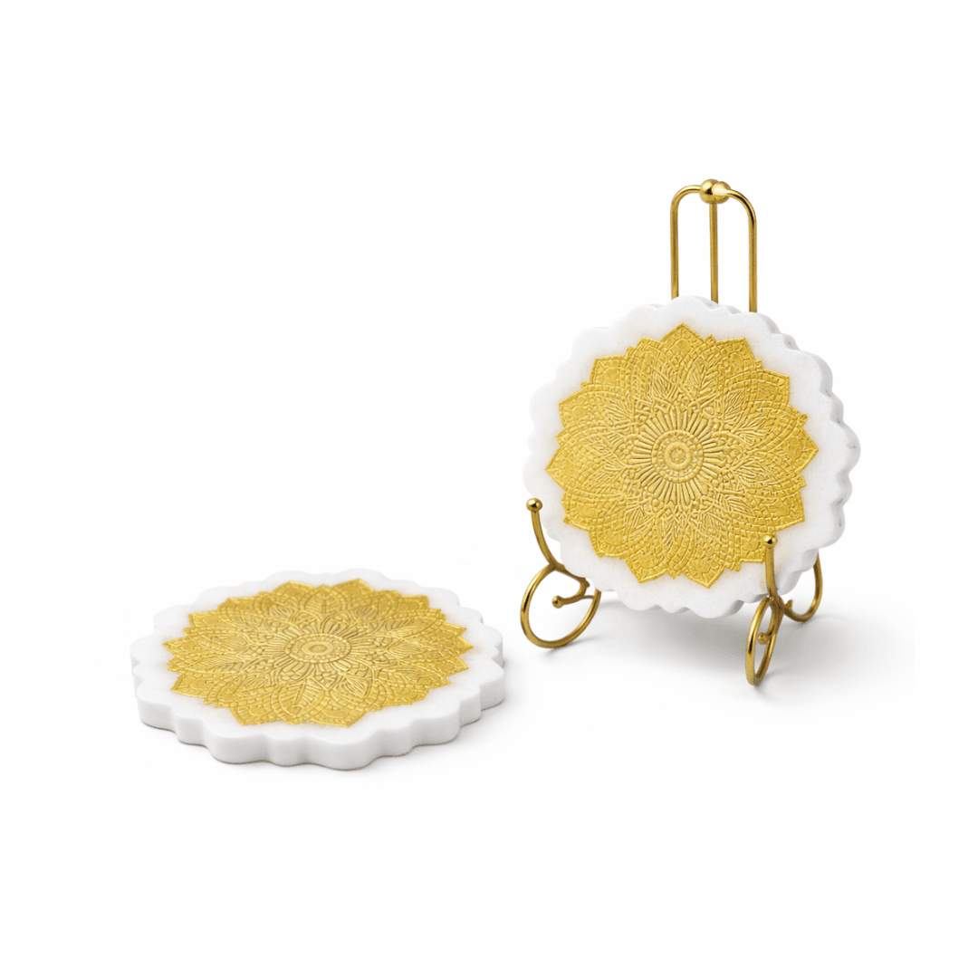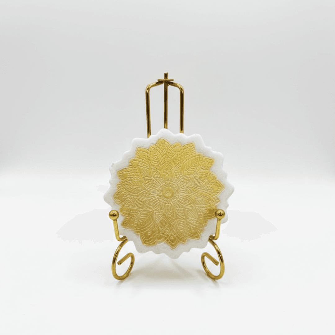 Luxury White and Gold, Dual Thick, Standard Size,Marbal Finish Handmade Two Mandala Coaster Set with Foldable Stand, Royal Home Decor Table Accessories, Set 0f 3