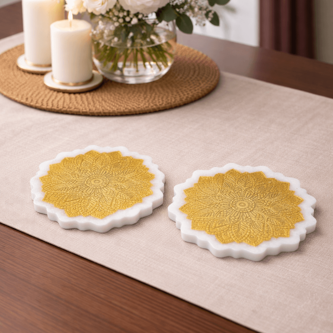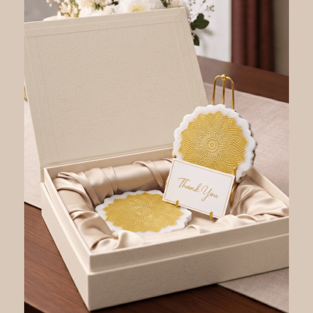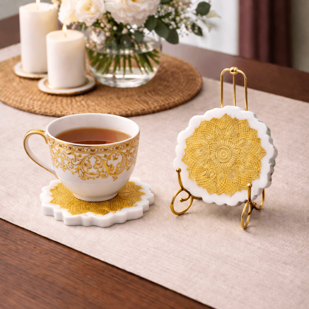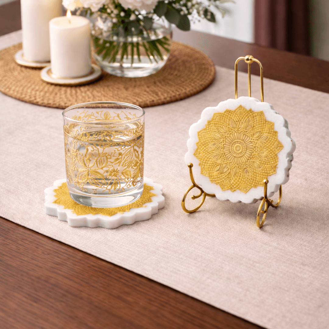 Luxury White and Gold, Dual Thick, Standard Size,Marbal Finish Handmade Two Mandala Coaster Set with Foldable Stand, Royal Home Decor Table Accessories, Set 0f 3