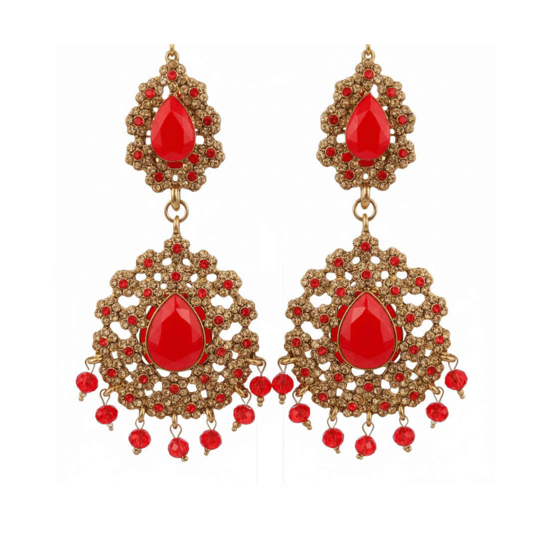 Superior Craftsmanship: Featuring intricate gold-toned filigree work, these earrings are adorned with vibrant red teardrop centerpieces and shimmering micro-crystals.