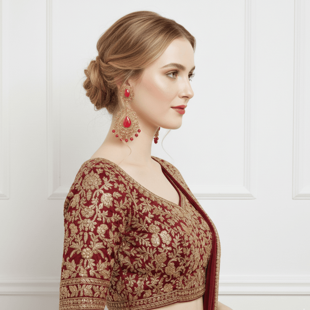 Traditional Meets Modern: Inspired by classic Kundan and Jhumka designs, the bold red accents and hanging bead tassels provide a rich, luxurious look.