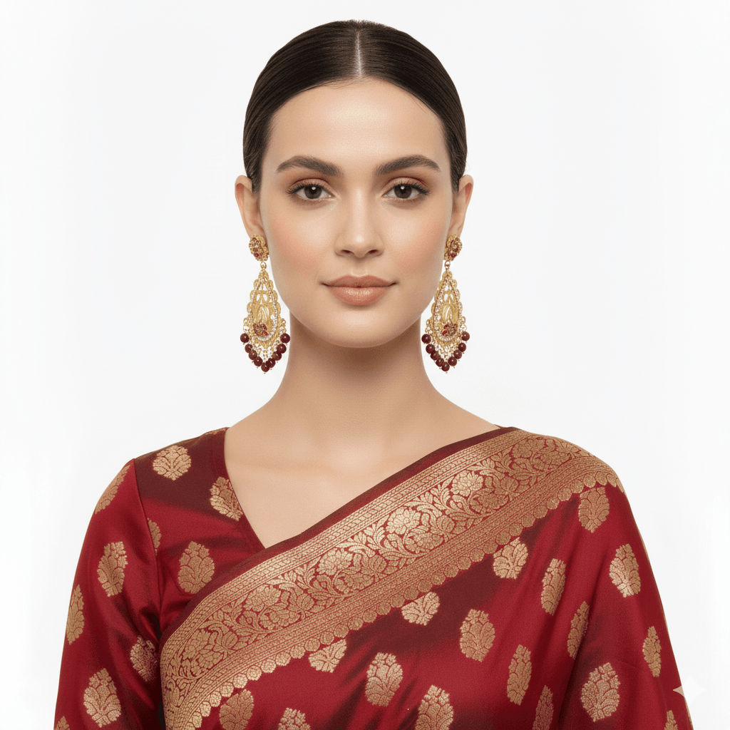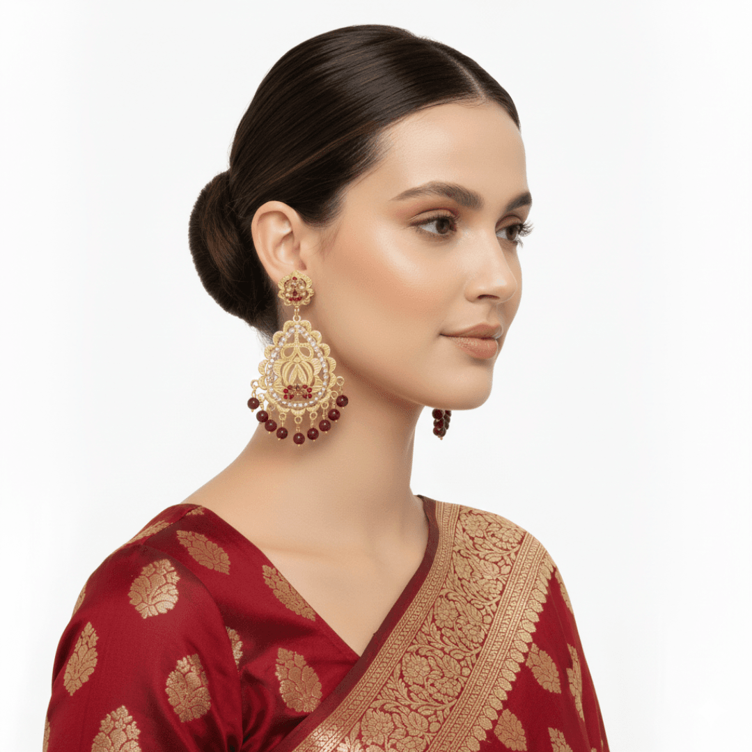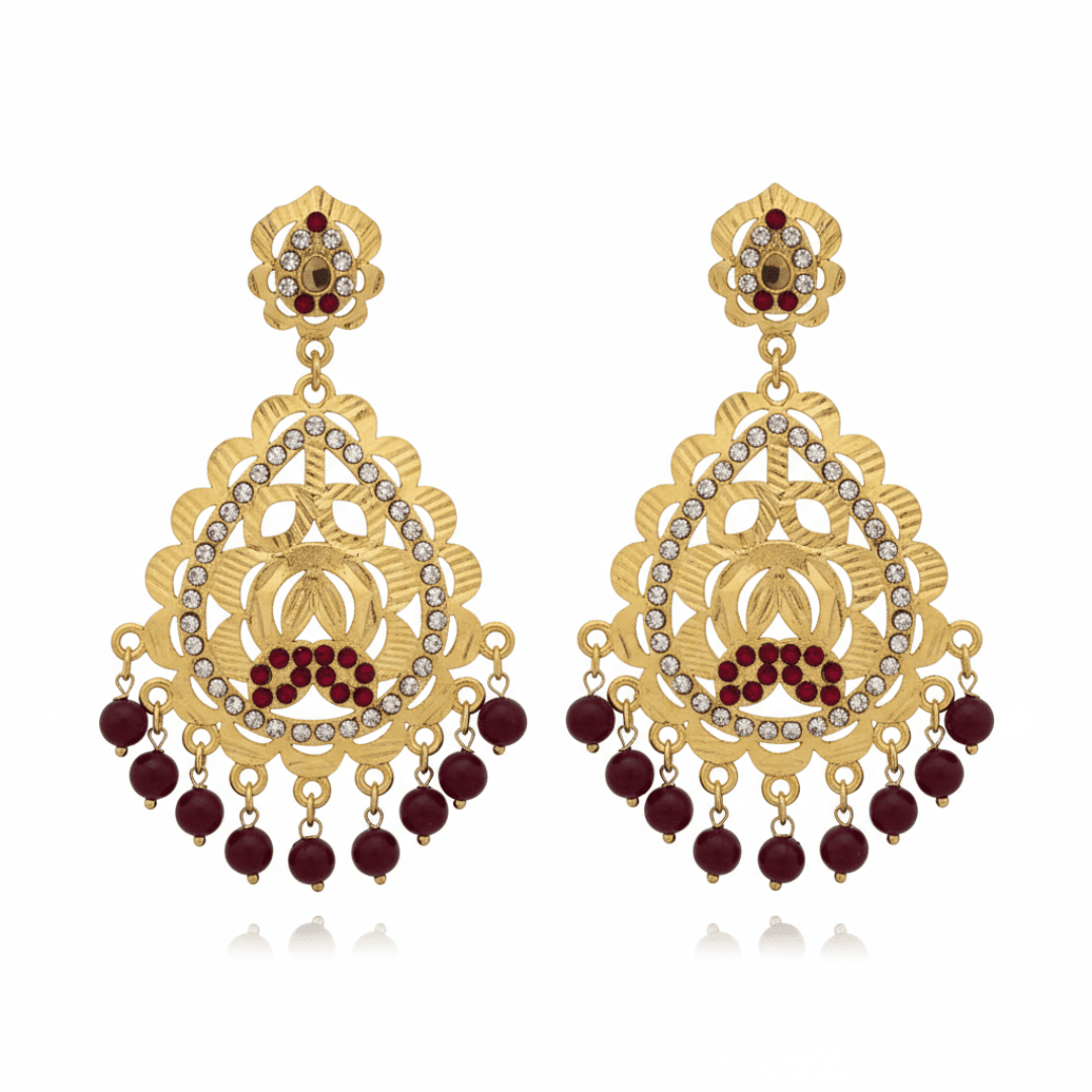 Shoppya Traditional 22K Gold-Plated Kundan & Maroon Bead Jhumka Earrings for Women | Ethnic Floral Filigree Drop Earrings with White Stone Embellishments